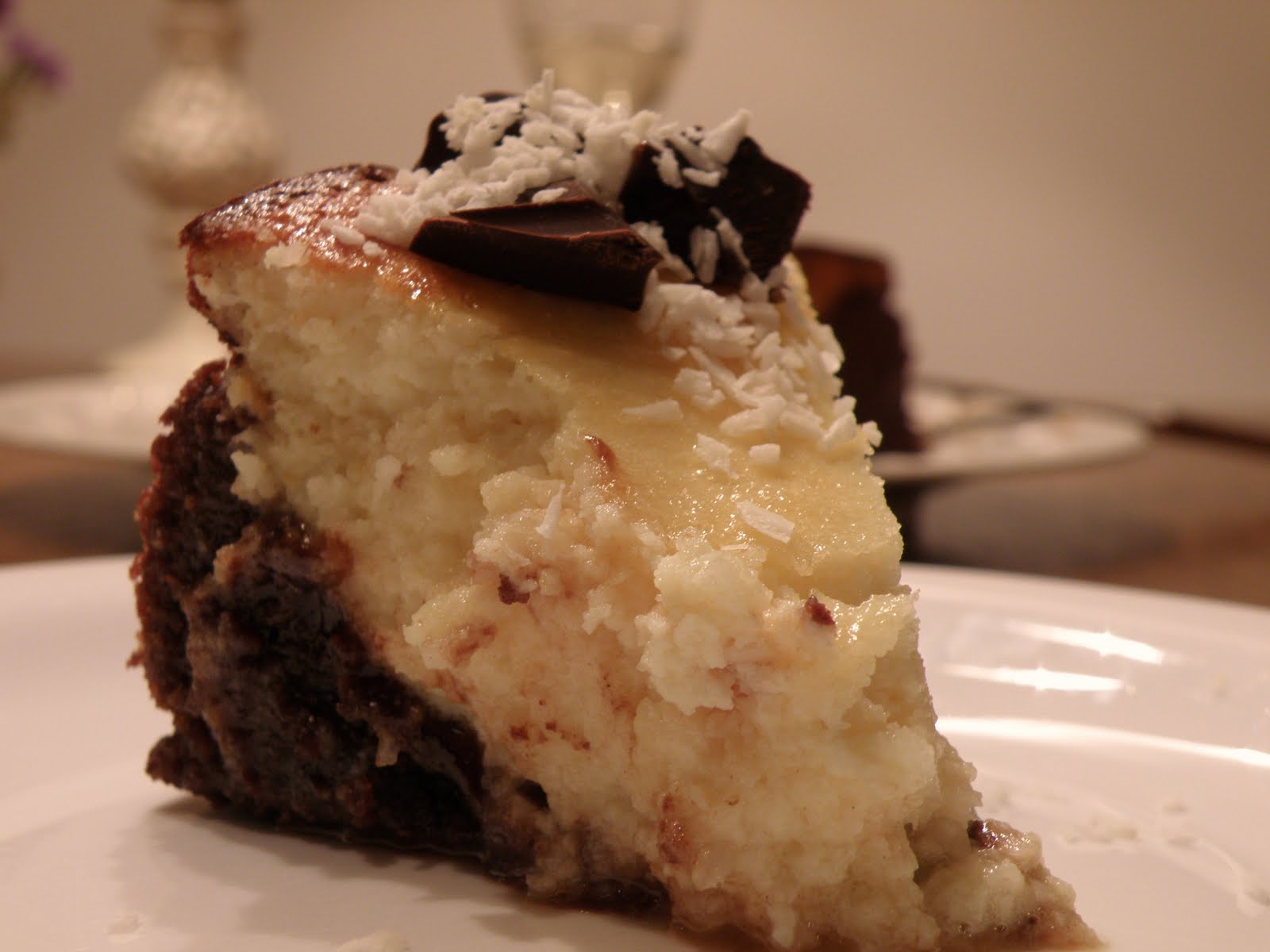 Sega kohupiimakreem munakollaste, suhkru, kookoshelveste ja vaniljeekstraktiga. Vahusta munavalged kõvaks vahuks ja lisa ettevaatlikult kohupiimasegu hulka. Vala küpsetuspaberiga vooderdatud lahtikäiva koogivormi (18cm) põhja kõigepealt šokolaadisegu ja seejärel kohupiimasegu. Küpseta kooki 175 kraadi juures 25-30 minutit, kuni pealt on kuldkollane. Lase pool tundi jahtuda ja serveeri siis.